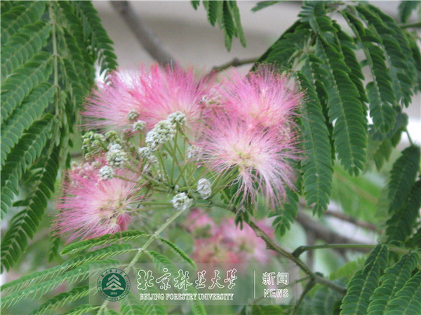 讀大學時,因為我是從青??歼^來的,又只讀了兩年的高中,高考成績全班倒數第一,入學后,深感和同學的差距。笨鳥先飛,我只有比別人多用功,多花時間,才能趕上同學的腳步。大一下學期六月的一天,因為快要期末考試了,我吃完午飯,就拿著書去木板房教室學習。中午的太陽明晃晃的掛在天上,知了的叫聲都變得懶洋洋了,教室里又悶又熱,我的學習效率不佳,于是,我拿著書走出了教室,循著樹蔭,邊走邊背,不知不覺就走到了生物樓門前的那條路。一陣微風吹來,眼前劃過一抹粉色,一朵淡粉色的小絨球飄落在了書上。仔細一看這個小絨球竟是那樣的柔軟,全身上下沒有一個花瓣,都是一些上粉下白的花絲,在熱氣中抖動著。仰頭望去慕然發現生物樓門前左右各有一棵傘狀的大樹,一片片羽狀的枝葉柔軟嫩綠,樹冠上開滿了粉紅的花簇,如在半空綠樹云中撐起一把把粉紅的小傘,既像鸚鵡頭上的羽冠,又好似搖動的羽毛扇。散垂的花絲如馬纓,點綴在郁郁蔥蔥的綠葉間,隨風搖曳;如裙紗,在舞女的陶醉中擺開,欲放又頷。低頭望去,滿地落纓,竟讓炙熱的水泥地,多了幾分清涼和柔美。小心的捻著細細的花莖,仿佛捻著滿懷思鄉之情,輕輕的夾在書里,看著枝頭兒的花蕊,閉了眼睛,深深地吸一口氣,一股淡雅而閑適的清香沁入心田,噢,思鄉的的感覺竟然也會這般清甜?忍不住去仰望,忍不住去想知道她的名字…