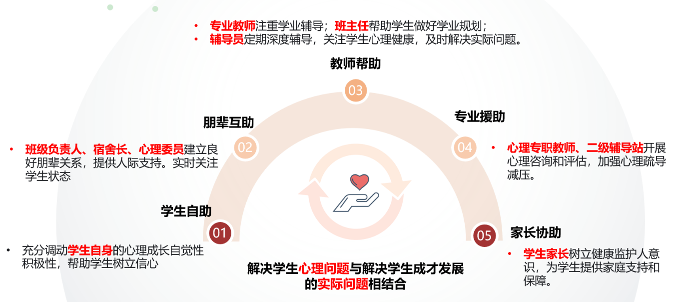 全員心理育人“五助工作法”是我校水保學(xué)院在解決成長困境型學(xué)生心理健康問題長期實踐中總結(jié)形成的典型做法。重點突出“以人為本”教育理念,堅持“黨委統(tǒng)籌、全員參與”工作思路,把解決心理問題與解決成才發(fā)展的實際問題相結(jié)合,協(xié)同發(fā)揮各類群體的育人功能和作用,通過教育學(xué)生自助,突出學(xué)生心理健康主體地位,調(diào)動學(xué)生心理成長的自覺性和積極性;指導(dǎo)朋輩互助,發(fā)揮朋輩輔導(dǎo)情感共鳴優(yōu)勢,營造“助人-自助-互助”健康氛圍;引導(dǎo)教師幫助,發(fā)揮各類教師群體作用,打造全員全方位育人工作鏈條;實施專業(yè)援助,完善校院心理工作溝通機制,協(xié)調(diào)聯(lián)動應(yīng)對心理危機;爭取家長協(xié)助,幫助家長樹立學(xué)生健康監(jiān)護人意識,凝聚家校合力支持學(xué)生成長發(fā)展,著力構(gòu)建全員參與的心理育人格局,為學(xué)生健康成長提供支持保障。