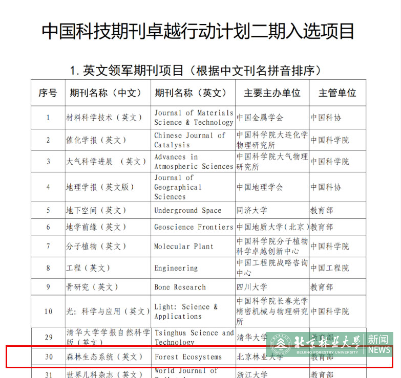中國科技期刊卓越行動計劃由中國科協(xié)、教育部、科技部、財政部、國家新聞出版署、中國科學(xué)院、中國工程院共同實施。該計劃作為迄今為止國家在期刊領(lǐng)域?qū)嵤┑牧Χ茸畲蟆①Y金最多、范圍最廣的重大支持專項,以建設(shè)世界一流科技期刊為核心目標,是在國家層面推動科技期刊高質(zhì)量發(fā)展的戰(zhàn)略舉措。自2019年項目啟動實施以來,經(jīng)過第一個五年周期的建設(shè),我國高水平科技期刊數(shù)量顯著增長。目前,全國共計5000多種科技期刊,1340種高水平期刊參與申報,最終463項入選。此次第二期卓越項目(2024—2028)設(shè)置英文單刊、中文單刊、高起點新刊、高水平辦刊人才培育、集群(集團)化試點5個子項目,實施周期為5年。其中英文領(lǐng)軍期刊共50種,教育系統(tǒng)共有9所高校有項目入選,其他入選單位主要分布在中國科學(xué)院和各行業(yè)學(xué)會,我校是林業(yè)領(lǐng)域唯一入選英文領(lǐng)軍期刊的單位,同時在高校入選期刊總數(shù)排名中并列第16。