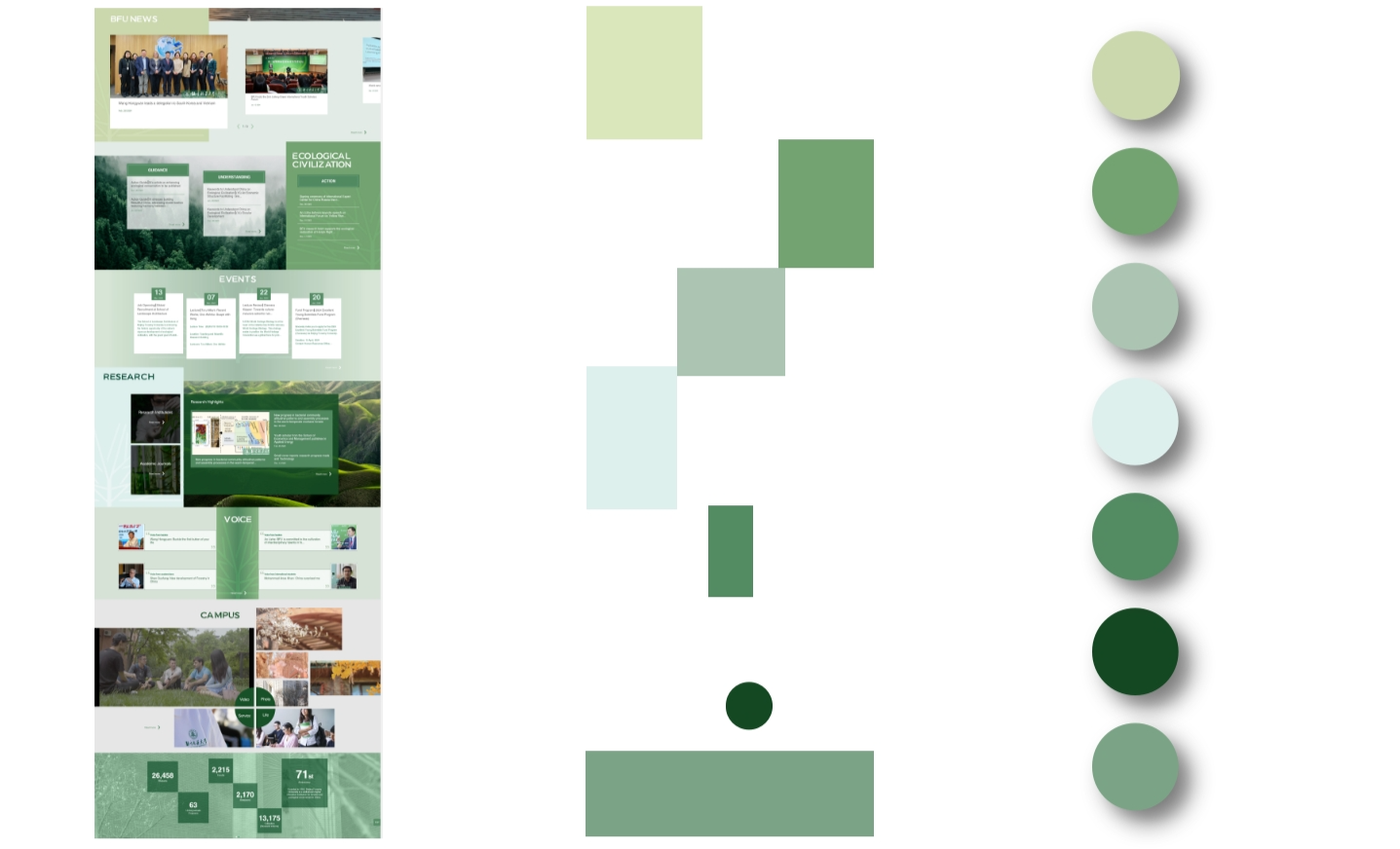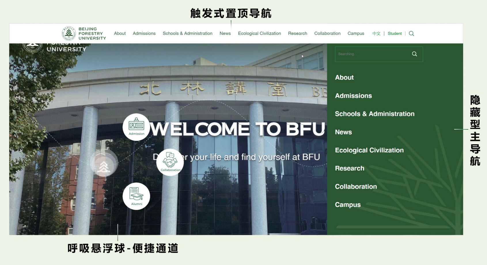 新版英文網(wǎng)站內(nèi)容架構(gòu)更加完善、視覺形象更加突出、功能體驗(yàn)更加優(yōu)化。設(shè)計(jì)上視覺識(shí)別性高,北林辨識(shí)度強(qiáng)。網(wǎng)站以“北林綠”為主題色,版式上錯(cuò)落構(gòu)圖,疏密有致,輔以校園地標(biāo)建筑和視覺形象識(shí)別系統(tǒng)圖形,加上專屬設(shè)計(jì)字體,彰顯北林文化內(nèi)涵和創(chuàng)新的符號(hào)表達(dá)。欄目上生態(tài)底色鮮明,人文底蘊(yùn)濃厚。網(wǎng)站增設(shè)全新欄目,拓展內(nèi)容形式。專設(shè)“生態(tài)文明建設(shè)”版塊,推介生態(tài)文明中國故事和我校實(shí)踐;新增北林聲音、學(xué)生風(fēng)采等專題,以故事講述為視角,展示北林人文風(fēng)采。功能上便捷國際交流,服務(wù)學(xué)生學(xué)者。觸發(fā)式置頂導(dǎo)航與隱藏式主導(dǎo)航設(shè)計(jì)使得內(nèi)容清晰與布局簡(jiǎn)約相統(tǒng)一,網(wǎng)站創(chuàng)新設(shè)計(jì)的呼吸懸浮球以校徽為核心標(biāo)識(shí),配合動(dòng)態(tài)的曲線路徑與呼吸節(jié)奏,象征著北林生生不息的生命力。呼吸懸浮球作為視覺引導(dǎo),同時(shí)也是快捷通道,美觀性與功能性并存。