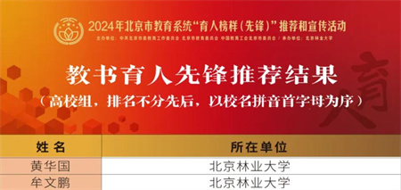 材料科學與技術學院曹金珍榮獲北京市教育系統“教書育人榜樣”稱號(系我校首次獲得),林學院黃華國、馬克思主義學院牟文鵬榮獲北京市教育系統“教書育人先鋒”稱號,黨委學生工作部阿巴斯·吐爾遜、環境科學與工程學院李凌榮獲北京市教育系統“管理育人先鋒”稱號,信息化建設與管理辦公室高顯俊、綜合保障部侯俊鵬榮獲北京市教育系統“服務育人先鋒”稱號。