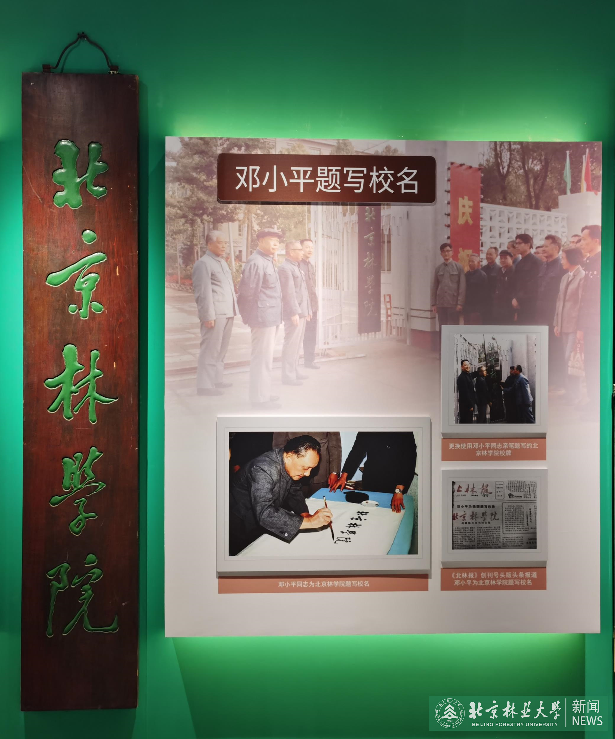 由鄧小平同志親筆題寫的校名“北京林學院”在校史館序廳展出,題字制作的學校牌匾在第三展廳展出。