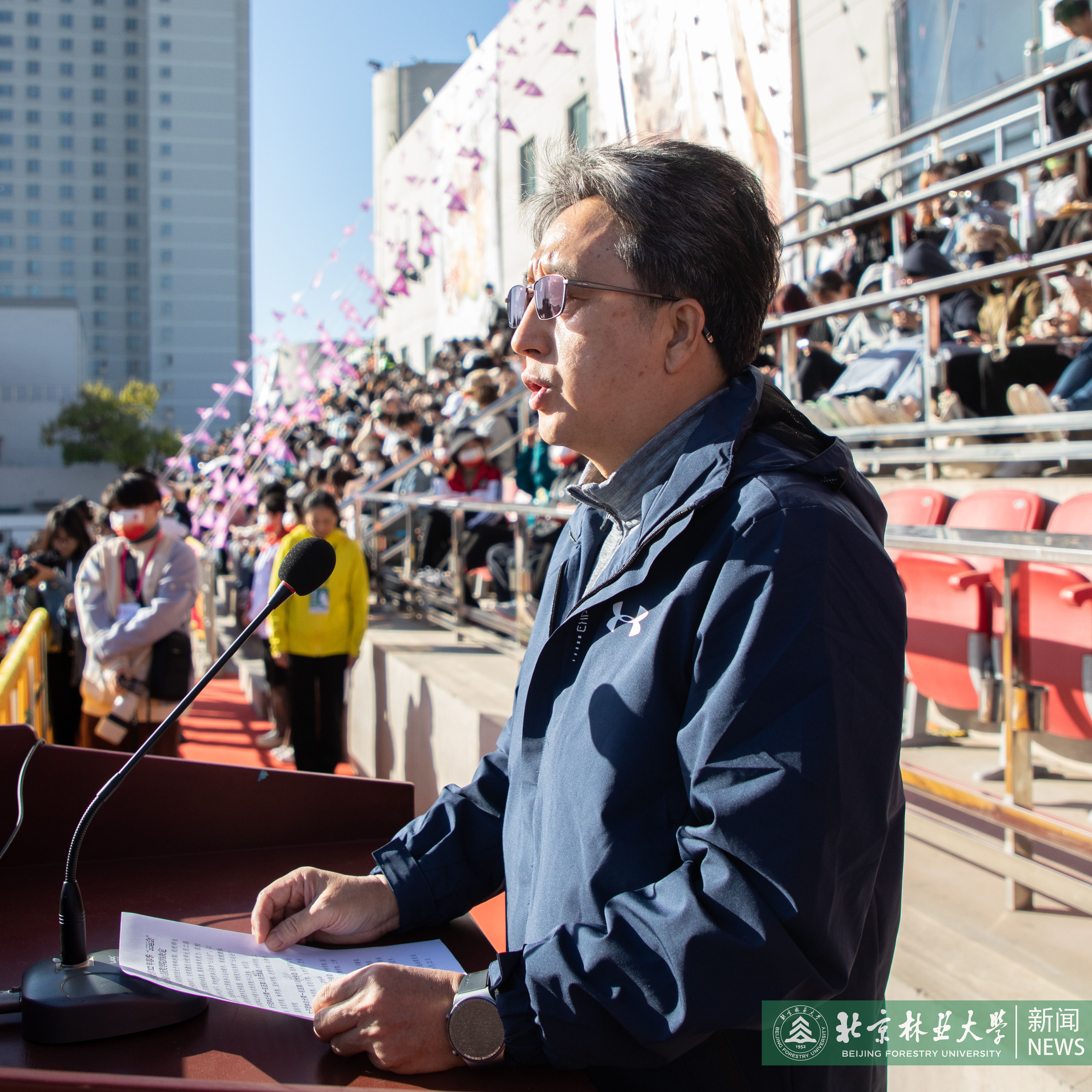 安黎哲致開幕詞。他指出,10月16日,黨的二十大勝利開幕,習近平總書記在二十大報告中提出:“促進群眾體育和競技體育全面發展,加快建設體育強國?!苯陙?,校黨委高度重視青年學生的體育工作,堅持“以人為本,健康第一”的指導思想,秉承“陽光體育,健康北林”的理念,持續深化身體素質課內外一體化改革,構建了“教會、勤練、常賽”的體育課新模式。不斷豐富校內群體聯賽內容和形式,扎實提高高水平運動隊和學生體育競賽水平。我校學子在北京冬奧會、全國田徑大獎賽等比賽中取得了好的成績,也向世界展示了北林學子熱愛體育的精神風貌和為國奉獻的使命擔當。他希望廣大學生繼續秉承“陽光體育、健康北林”的體育文化理念,在體育鍛煉中增強體質、健全人格、鍛煉意志、塑造品格、養成精神、享受樂趣,努力成長為德智體美勞全面發展的社會主義建設者和接班人。