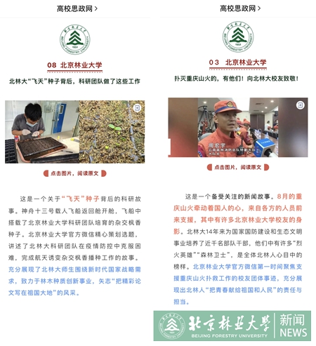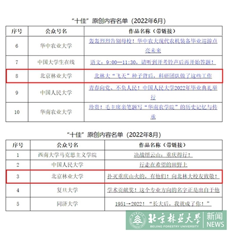 近日,由教育部主管、教育部思政司指導的全國高校思想政治工作網公布高校重點建設公眾號優秀原創內容評選結果。2022年6月—8月,高校重點建設公眾號共發文21802篇,我校兩篇官微推文《北林大“飛天”種子背后,科研團隊做了這些工作》《撲滅重慶山火的,有他們!向北林大校友致敬!》從390件申報推文中脫穎而出,分別獲6月、8月“十佳”原創內容(全國高校每月僅10篇)。