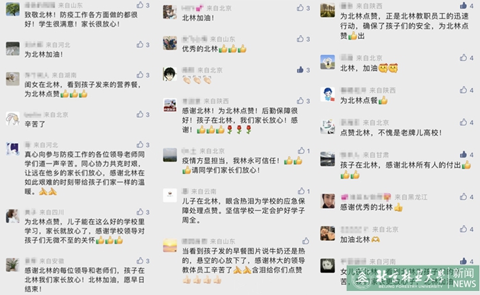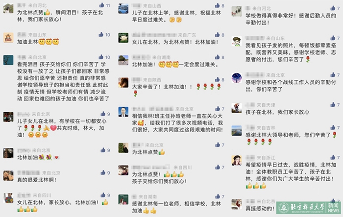 還有許多家長通過暖心的留言、字符表情等,向?qū)W校傳遞他們的關懷與鼓勵?!氨绷值难杆傩袆樱_保了孩子們的健康與安全,為北林點贊!”網(wǎng)名為“糖串”的家長說?!把绢^在北林,真真切切感受到北林大家庭的溫暖,尤其疫情期間北林防疫速度必須點贊!”網(wǎng)名為“孫燕霞”的家長說?!拔壹覍氊愒诒绷郑≡?號樓,她告訴我學校發(fā)的牛奶是熱的,瞬間好感動!”網(wǎng)名為“蕙質(zhì)蘭心”的家長說。“孩子說學校配送的一日三餐營養(yǎng)搭配,非常美味,感謝北林老師和后勤保障人員的辛勤付出!”網(wǎng)名為“春風自來”的家長說。“面對嚴峻復雜的疫情,對孩子們的生活有所擔心,現(xiàn)在看到推送里學校透明高效的措施、科學精確的管理,我現(xiàn)在終于放心了!謝謝北林!”網(wǎng)名為“Q”的家長說。