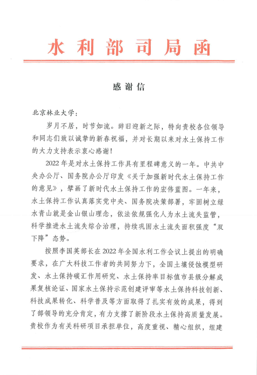 1月17日,水利部水土保持司向我校致感謝信,感謝我校長期以來對(duì)水土保持工作的大力支持,以及教師團(tuán)隊(duì)攻堅(jiān)克難、扎實(shí)工作為有關(guān)科研項(xiàng)目做出的積極貢獻(xiàn)。