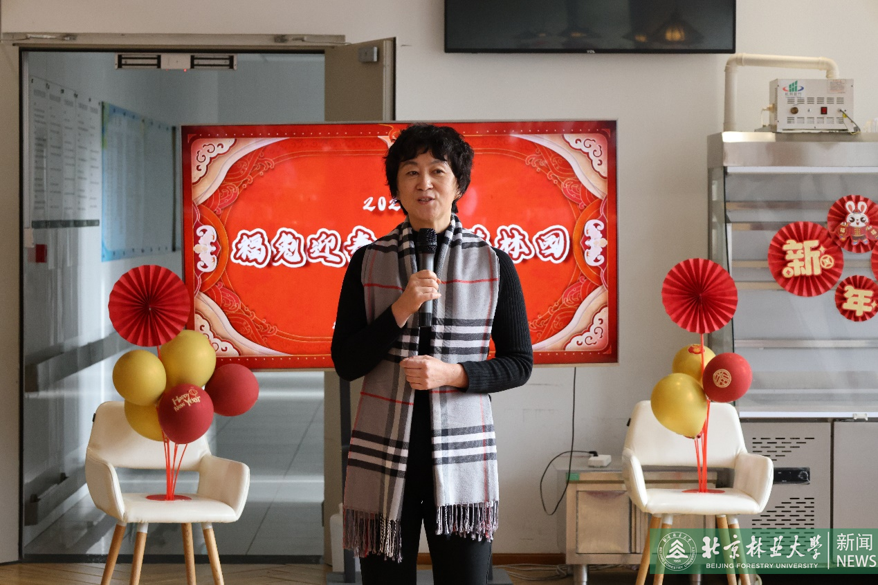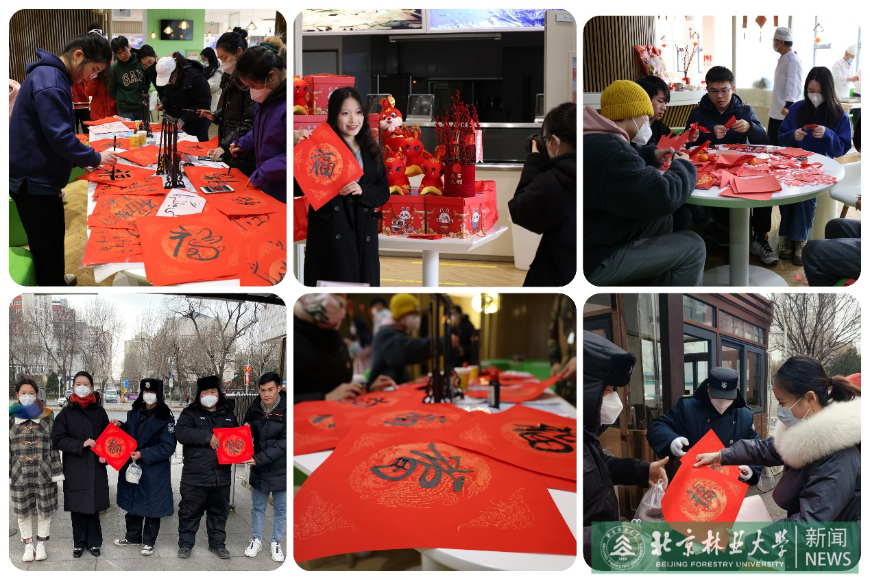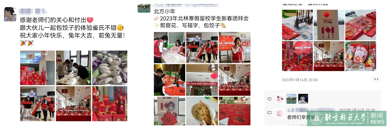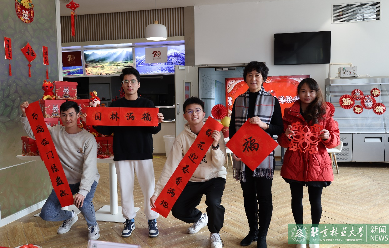 團拜會暖意融融,年味十足。師生共同寫福字、剪窗花、包餃子,學生代表匯報了留校過年的學習生活情況及新年期許。會上,學生代表為領導、老師、廚師代表送上自己寫的福字、剪的窗花,感謝老師、員工們的辛勤付出和關心關愛,祝福北林“福滿林園”;校園內,學生代表把用心包好、第一鍋出爐、熱氣騰騰的餃子和寫好的福字送到了學校各個校門值崗的保安員和各公寓樓宿管員的手中,同時送上心意滿滿的感謝和祝福。