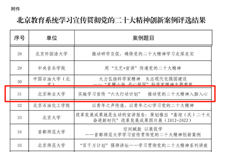 北京林業大學黨委把學習宣傳貫徹黨的二十大精神作為當前首要政治任務,制定工作方案、狠抓任務落實。聚焦學習培訓、宣講巡講、教育教學、研究闡釋、主題教育和新聞宣傳六個方面,實施學習宣傳“六大行動計劃”,推動黨的二十大精神入腦入心。