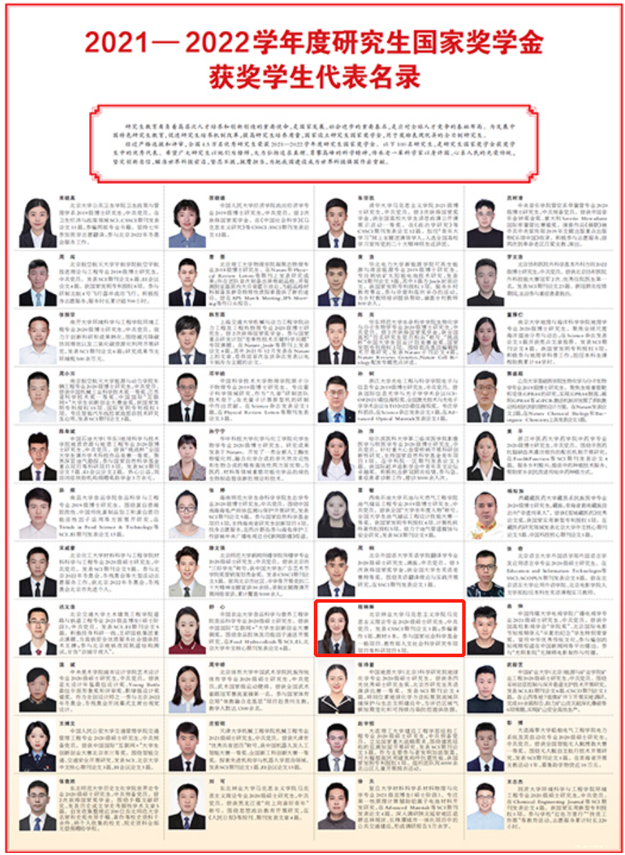 《人民日?qǐng)?bào)》指出,研究生教育肩負(fù)著高層次人才培養(yǎng)和創(chuàng)新創(chuàng)造的重要使命,是國(guó)家發(fā)展、社會(huì)進(jìn)步的重要基石,是應(yīng)對(duì)全球人才競(jìng)爭(zhēng)的基礎(chǔ)布局。為發(fā)展中國(guó)特色研究生教育,促進(jìn)研究生培養(yǎng)機(jī)制改革,提高研究生培養(yǎng)質(zhì)量,國(guó)家設(shè)立研究生國(guó)家獎(jiǎng)學(xué)金,用于獎(jiǎng)勵(lì)表現(xiàn)優(yōu)異的全日制研究生。經(jīng)過(guò)嚴(yán)格選拔和評(píng)審,全國(guó)4.5萬(wàn)名優(yōu)秀研究生榮獲2021—2022學(xué)年度研究生國(guó)家獎(jiǎng)學(xué)金。入選的100名研究生,是研究生國(guó)家獎(jiǎng)學(xué)金獲獎(jiǎng)學(xué)生中的優(yōu)秀代表。希望廣大研究生以他們?yōu)榘駱樱罅霌P(yáng)追求真理、勇攀高峰的科學(xué)精神,傳承老一輩科學(xué)家以身許國(guó)、心系人民的光榮傳統(tǒng),堅(jiān)定創(chuàng)新自信,瞄準(zhǔn)世界科技前沿,堅(jiān)忍不拔,挺膺擔(dān)當(dāng),為把我國(guó)建設(shè)成為世界科技強(qiáng)國(guó)作出貢獻(xiàn)。
