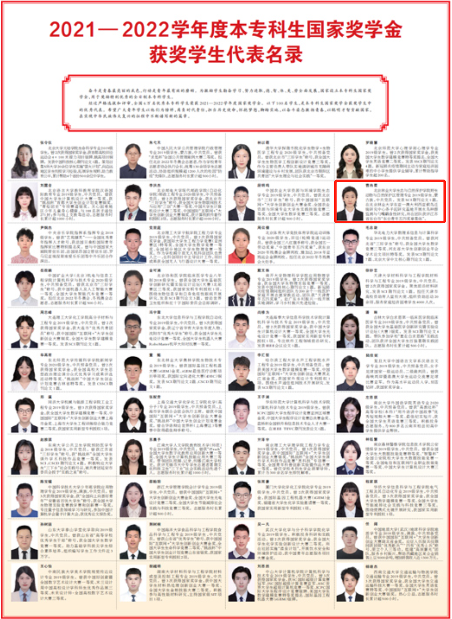公告鏈接:《人民日?qǐng)?bào)》(2023年5月4日)2021—2022學(xué)年度本專科生國(guó)家獎(jiǎng)學(xué)金獲獎(jiǎng)學(xué)生代表名錄 、2021—2022學(xué)年度研究生國(guó)家獎(jiǎng)學(xué)金獲獎(jiǎng)學(xué)生代表名錄。