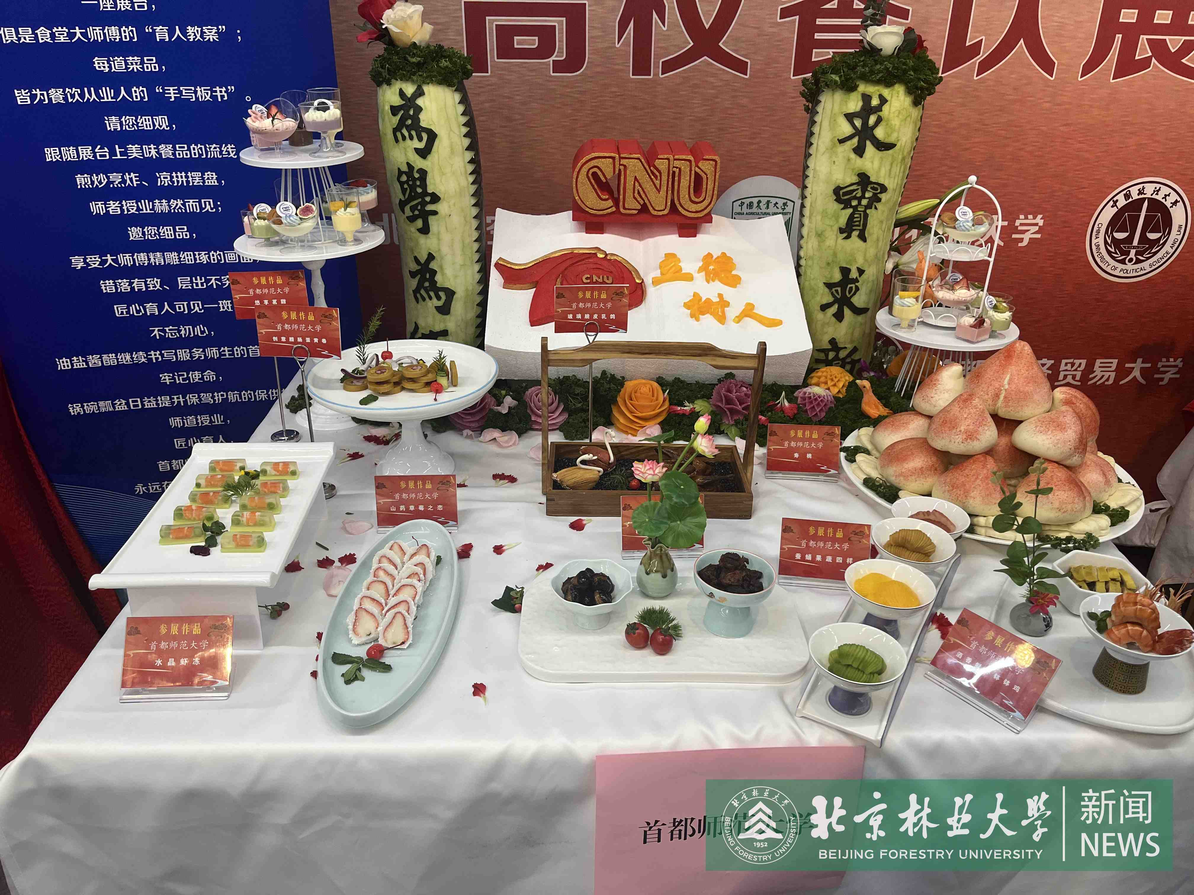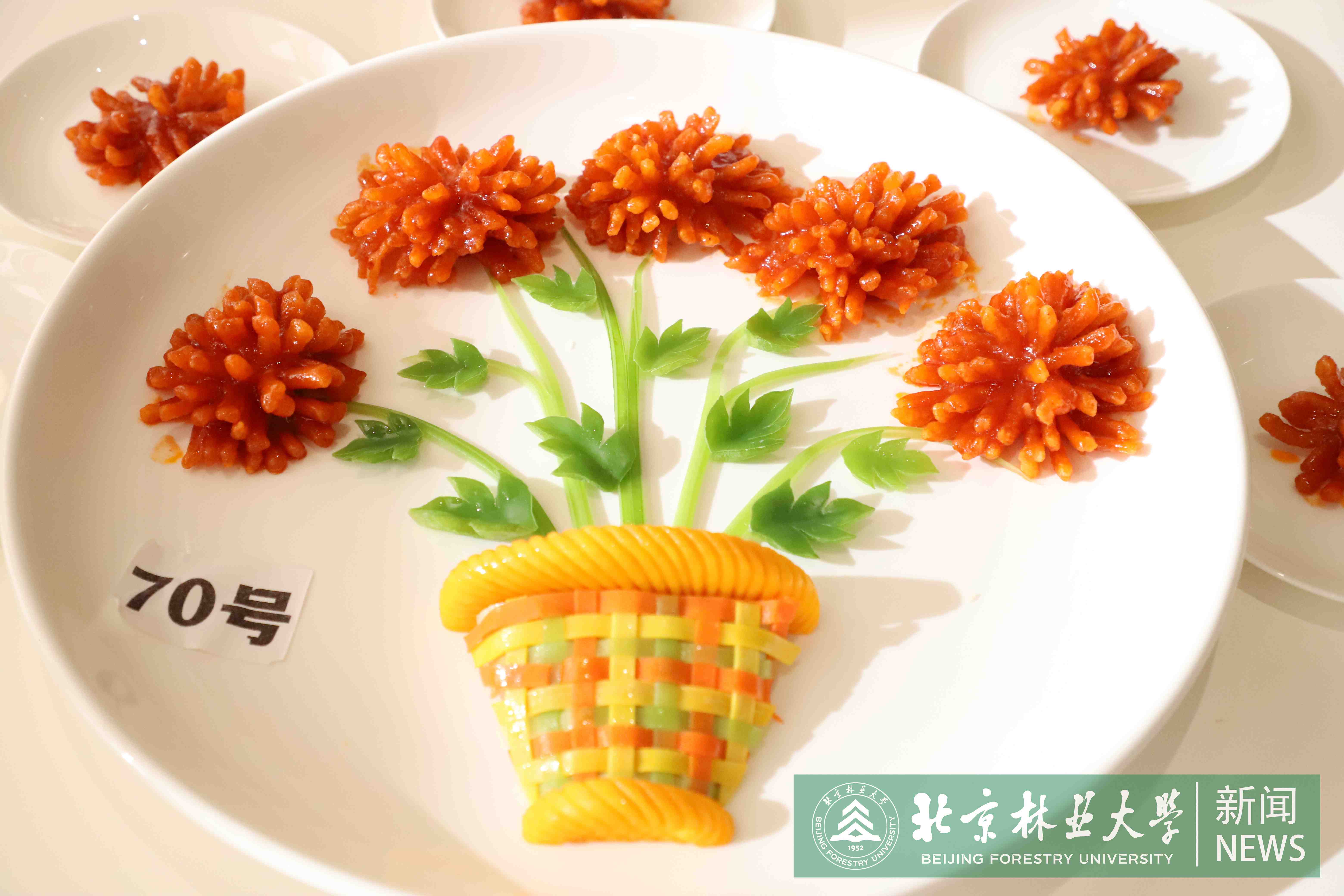 我校在本次烹飪技能大賽中派出3名參賽選手,杜忠?guī)煾档募t案作品《菊花里脊》、趙連紅師傅的白案作品《荷花酥》以及張建鋒師傅的冷拼作品《銀杏大道》均榮獲金勺獎(jiǎng),我校榮獲團(tuán)體一等獎(jiǎng),充分展現(xiàn)了我校餐飲團(tuán)隊(duì)的高超技藝和創(chuàng)意水平。在本次展會(huì)上,我校精心設(shè)計(jì)并布置了以“山水林田湖草沙”生命共同體為主題的展臺(tái)作品,聚焦生態(tài)體系,突出生態(tài)元素與食材細(xì)節(jié)的巧妙融合,展現(xiàn)了食材取之于自然,人回饋?zhàn)匀坏拿缹W(xué)關(guān)系。