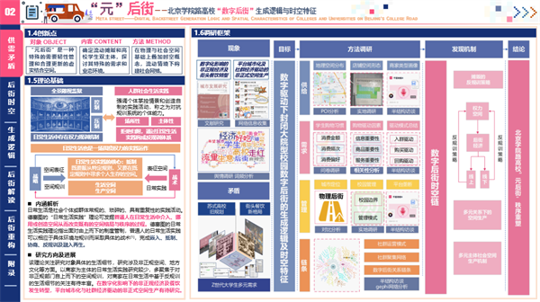 其中一等獎作品為“元”后街——北京學院路高校數字后街生成邏輯及時空特征,由學院錢云、畢波為指導教師,孟子一、韓逸雪、劉芳君、劉舒然等4名同學組成的團隊設計完成。作品選取北京學院路高校周邊“數字后街”為研究對象,通過訪談、問卷、觀察、數據爬取等方法收集一手資料,采用定性與定量結合的分析方法,探究封閉大院型校園如何在數字技術和社群經濟的發展驅動下形成虛擬與現實結合的數字后街,最終構建社會網絡并進行規律探討,提出問題,對“元后街”的未來進行展望。