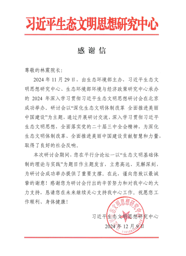 習(xí)近平生態(tài)文明思想研究中心(生態(tài)環(huán)境部)向我校發(fā)來感謝信,感謝智庫中心林震積極參與生態(tài)環(huán)境部主辦的“深入學(xué)習(xí)貫徹習(xí)近平生態(tài)文明思想研討會”論壇并作主題發(fā)言,為研討會成功舉辦提供了重要支撐。