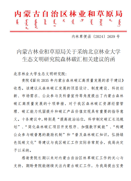 內(nèi)蒙古自治區(qū)林業(yè)和草原局向我校生態(tài)文明研究院發(fā)來感謝信,信中提到,《面向2035年內(nèi)蒙古森林碳匯高質(zhì)量發(fā)展的若干建議》智庫報告與內(nèi)蒙古自治區(qū)碳匯工作實(shí)際非常契合,被予以采納,感謝對內(nèi)蒙古森林碳匯高質(zhì)量發(fā)展提出的寶貴意見與建議,以及長期以來對內(nèi)蒙古自治區(qū)林草碳匯工作的關(guān)心與支持。