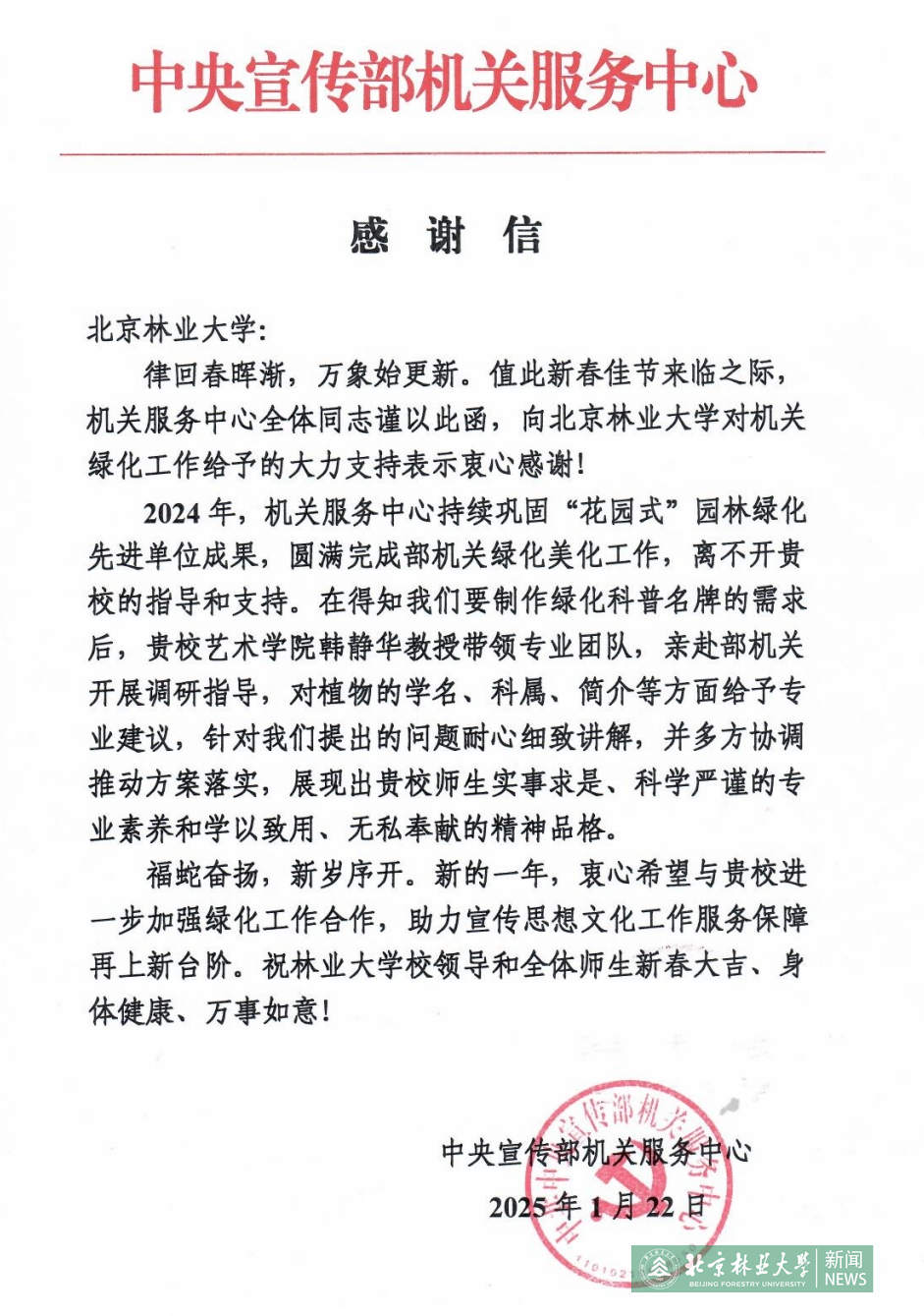 2025年1月22日,中央宣傳部機(jī)關(guān)服務(wù)中心向我校發(fā)來感謝信。信中表示,機(jī)關(guān)綠化美化工作的圓滿完成離不開北京林業(yè)大學(xué)的指導(dǎo)和支持。我校藝術(shù)設(shè)計(jì)學(xué)院韓靜華教授帶領(lǐng)專業(yè)團(tuán)隊(duì),對植物的學(xué)名、科屬、簡介等方面給予專業(yè)建議,并多方協(xié)調(diào)推動方案落實(shí),展現(xiàn)出北京林業(yè)大學(xué)師生實(shí)事求是、科學(xué)嚴(yán)謹(jǐn)?shù)膶I(yè)素養(yǎng)和學(xué)以致用、無私奉獻(xiàn)的精神品格。