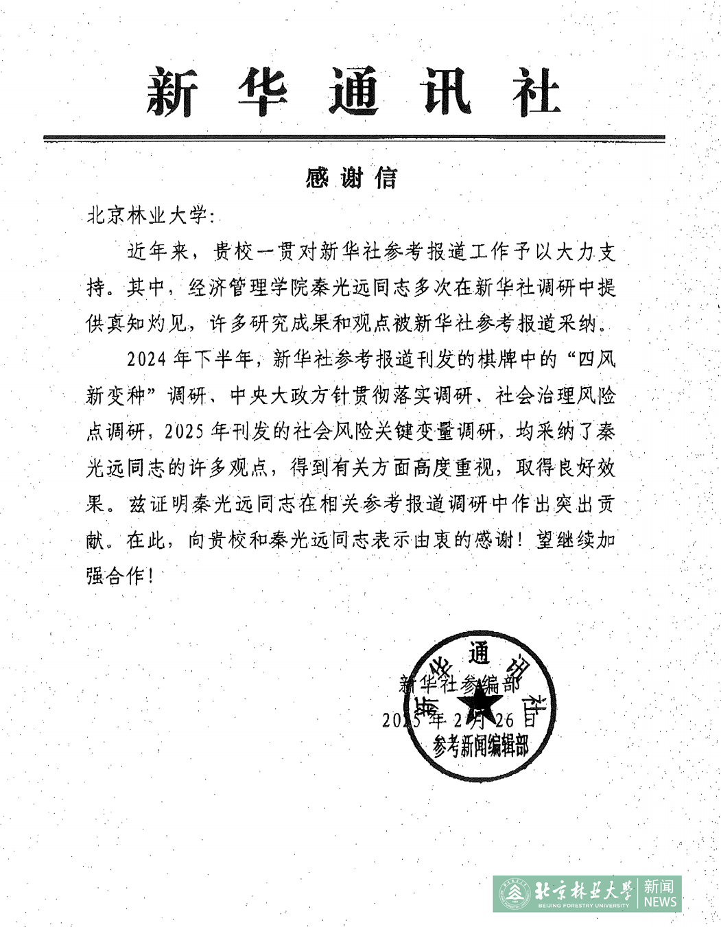 2025年2月26日,新華通訊社參考新聞編輯部向我校發(fā)來感謝信,感謝我校一直以來對新華社參考報(bào)道工作予以的大力支持。信中表示,我校經(jīng)濟(jì)管理學(xué)院秦光遠(yuǎn)同志在新華社參考報(bào)道刊發(fā)的棋牌中的“四風(fēng)新變種”等多個調(diào)研中提供真知灼見,許多研究成果和觀點(diǎn)被新華社參考報(bào)道采納,對此表示由衷感謝。