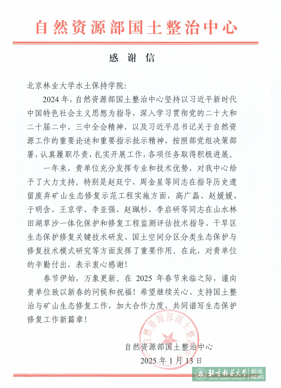 2025年1月13日,自然資源部國土整治中心向我校發(fā)來感謝信,感謝我校充分發(fā)揮專業(yè)和技術(shù)優(yōu)勢,對中心給予大力支持。信中同時對我校趙廷寧、周金星等同志在指導(dǎo)歷史遺留廢棄礦山生態(tài)修復(fù)示范工程實(shí)施方面,對高廣磊、趙媛媛、于明含、王京學(xué)、李亞強(qiáng)、趙珮杉、李啟研等同志在山水林田湖草沙一體化保護(hù)和修復(fù)工程監(jiān)測評估技術(shù)指導(dǎo)、干旱區(qū)生態(tài)保護(hù)修復(fù)關(guān)鍵技術(shù)研發(fā)、國土空間分區(qū)分類生態(tài)保護(hù)與修復(fù)技術(shù)模式研究等方面發(fā)揮的重要作用表示肯定。