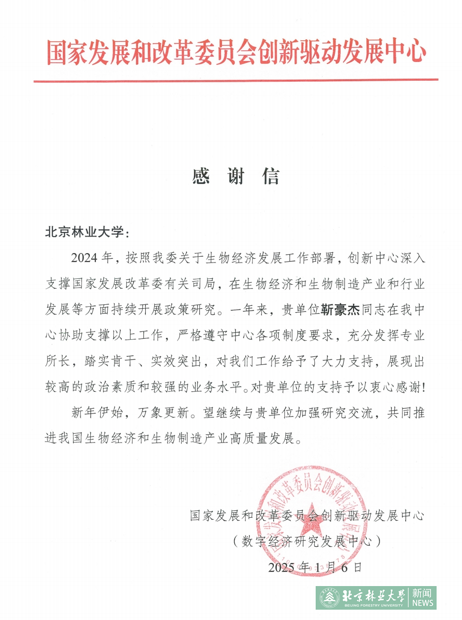 2025年1月6日,國家發(fā)展和改革委員會創(chuàng)新驅(qū)動發(fā)展中心向我校發(fā)來感謝信。信中提到,2024年我校靳豪杰同志充分發(fā)揮專業(yè)所長,協(xié)助中心在生物經(jīng)濟(jì)和生物制造產(chǎn)業(yè)和行業(yè)發(fā)展等方面積極開展政策研究,實(shí)效突出,衷心感謝北京林業(yè)大學(xué)的大力支持。