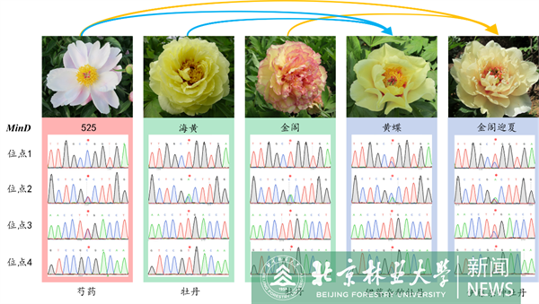 課題組還利用了兩對親本和子代已知的伊藤牡丹雜交組合,對親本和子代各品種中的四個基因進行了測序分析(圖3),結果和上述結果一致。