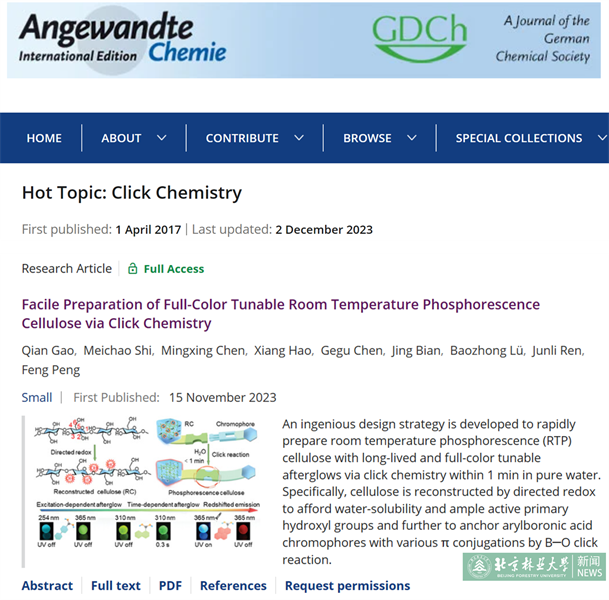 近日,材料科學與技術學院彭鋒教授課題組在纖維素基室溫磷光(RTP)材料研究領域取得新進展,研究論文以“Facile preparation of full-color tunable room temperature phosphorescence cellulose via click chemistry”為題發表于材料領域一區Top期刊《Small》(IF="13.3),并入選《Angew. Chem. Int. Ed.》最新一期的點擊化學熱點話題文章(Hot Topic: Click Chemistry)。