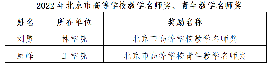 近日,北京市教育委員會公布了2022年“北京市高等學校教學名師獎”、“北京高校優秀本科育人團隊”、“北京高校優秀教學管理人員”、“北京高校優秀本科實驗教學指導教師”、北京高校“優質本科課程”和“優質本科教材課件”評選結果,我校林學院劉勇教授、工學院康峰教授分別榮獲第十八屆北京市高等學校教學名師獎和第六屆北京市高等學校青年教學名師獎,以園林學院鄭曦教授為帶頭人的“風景園林專業本科育人團隊”獲評北京高校優秀本科育人團隊,教務處副處長王毅力獲評北京高校優秀教學管理人員,工學院高級實驗師吳健獲評北京高校優秀本科實驗教學指導教師,《木材學A》等5門課程被認定為北京高校“優質本科課程”、《數據庫原理及應用教程(第四版)》等4部教材課件被認定為北京高?!皟炠|本科教材課件”。其中,北京高校優秀本科實驗指導教師獎勵于2022年首次設立。
