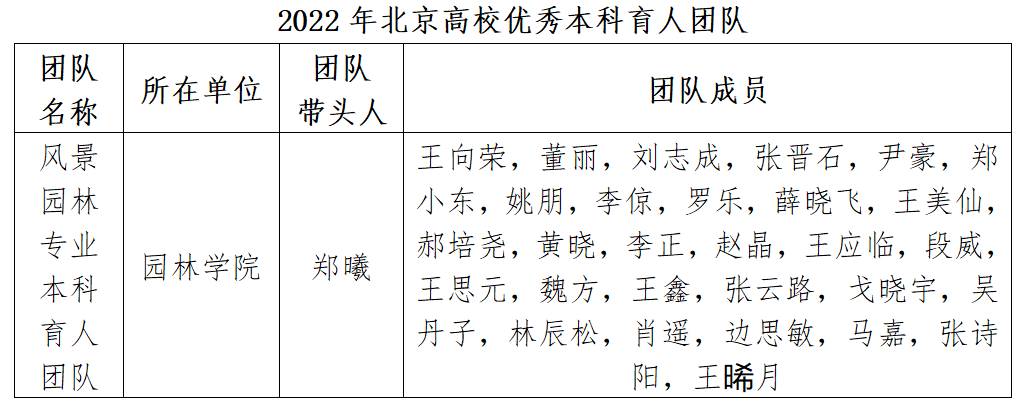 團隊育人效果顯著,形成“名師引領-學科交叉-線上線下協同”團隊建設與運行機制,建設10大課程組,主持教育部教改項目8項,北京市教改項目5項,發表教改論文56篇,出版教材25部,獲省部級以上教學成果獎30余項。專業核心課程風景園林設計(雙語)入選國家級一流本科課程、北京高校優質本科課程。拓展“交叉協同、校企共建、中外共融”的拔尖創新風景園林實踐育人平臺,建成國家級園林實驗教學示范中心、數字景觀實驗室、“風景園林設計”虛擬教研室等省部級教學實踐平臺8項;開辟國內外實踐教學基地30余處,打造國際花園建造節、校企聯合畢業設計等具有卓越示范效應的實踐育人活動。依托“城鄉生態環境北京實驗室”建立了科教融合協同育人機制,主持國家重點研發等科研項目20余項。指導學生獲IFLA大學生設計競賽等世界級、全國級獎項100余項,培育了一批既具有家國情懷和時代擔當、又敢于質疑勇于創新的風景園林拔尖創新人才,為推進生態文明建設、鄉村振興等重大戰略提供強有力支撐。