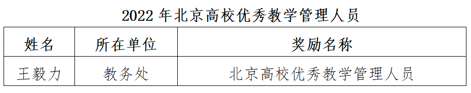 截至目前,我校共有北京市教學名師31名,青年教學名師6名,北京高校優秀本科育人團隊3支,北京高校優秀教學管理人員4人,北京高校優秀本科實驗教學指導教師1人,北京高校優質本科課程17門,北京高校優質本科教材課件16部。