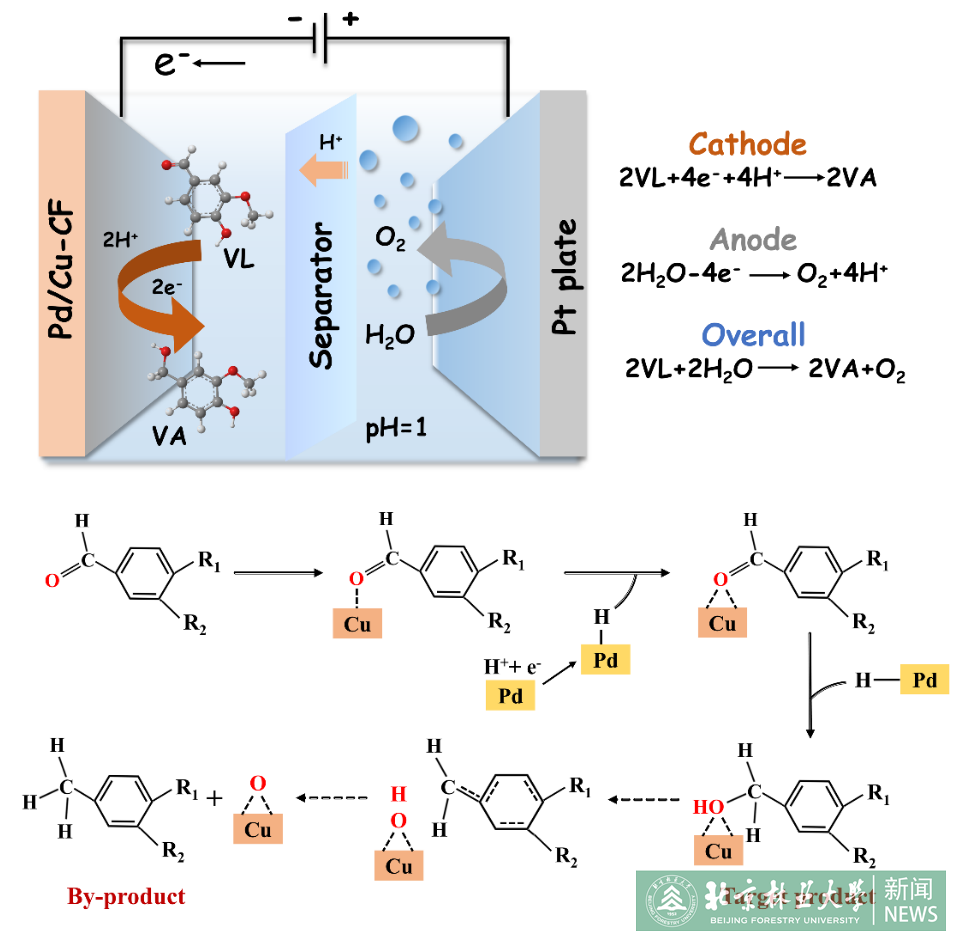 日前,材料學院和理學院課題組合作在林木生物質(zhì)衍生物電化學催化加氫領域取得新進展。苯甲醛類和糠醛類物質(zhì)分別是林木生物質(zhì)木質(zhì)素和綜纖維素組分的主要衍生物,作為原料可以生產(chǎn)多種高附加值的精細化學品和活性物質(zhì),用于替代石化資源生產(chǎn)生物基材料和生物化工產(chǎn)品。與傳統(tǒng)化學加氫還原方法相比,電化學還原方法以水作為氫源,具有反應條件溫和、過程可控性好和能耗較低等優(yōu)勢。新型高效率催化劑的制備和反應體系的設計是實現(xiàn)林木衍生物電化學高效轉(zhuǎn)化的關鍵。