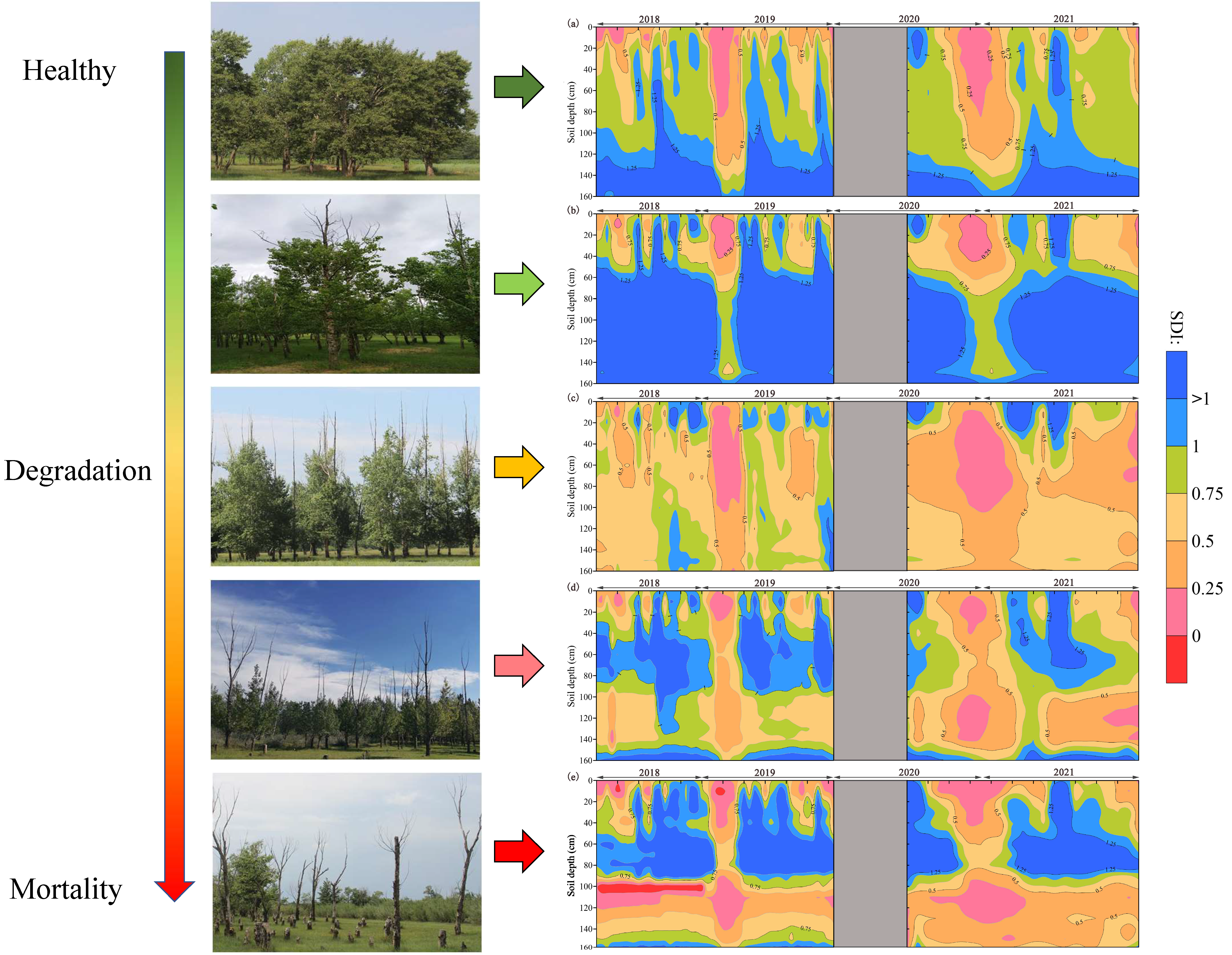近年來,土壤水分虧缺導致三北防護林衰退死亡問題受到廣泛關注,但防護林退化與土壤水分動態的相互作用機制尚不清楚。小葉楊是三北防護林工程常用樹種之一,確定小葉楊退化與土壤水分之間的響應關系對于三北防護林建設管理具有重要意義。