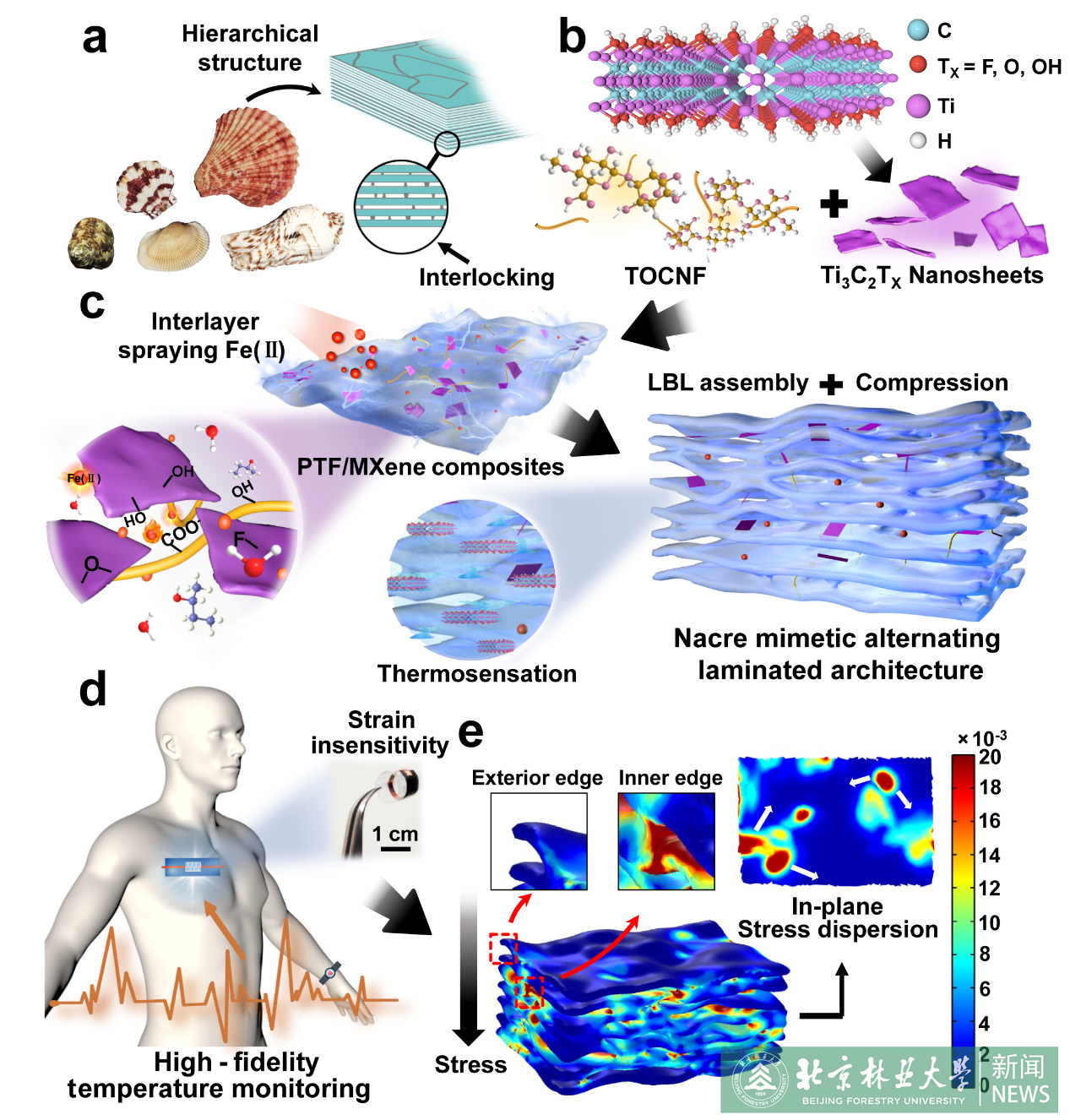 近日,我校材料學(xué)院研究團(tuán)隊(duì)受貝殼材料異質(zhì)結(jié)構(gòu)和層間高強(qiáng)度礦物橋協(xié)同增韌機(jī)制的啟發(fā),創(chuàng)新性地提出金屬配位層間交聯(lián)方法,解決了柔性熱敏彈性體在可穿戴應(yīng)用方面的關(guān)鍵科學(xué)問(wèn)題,展示了納米纖維素在不同維度結(jié)構(gòu)復(fù)合材料制備上的范例,實(shí)現(xiàn)了在多個(gè)場(chǎng)景中無(wú)信號(hào)失真的可穿戴熱敏彈性體溫度檢測(cè)。