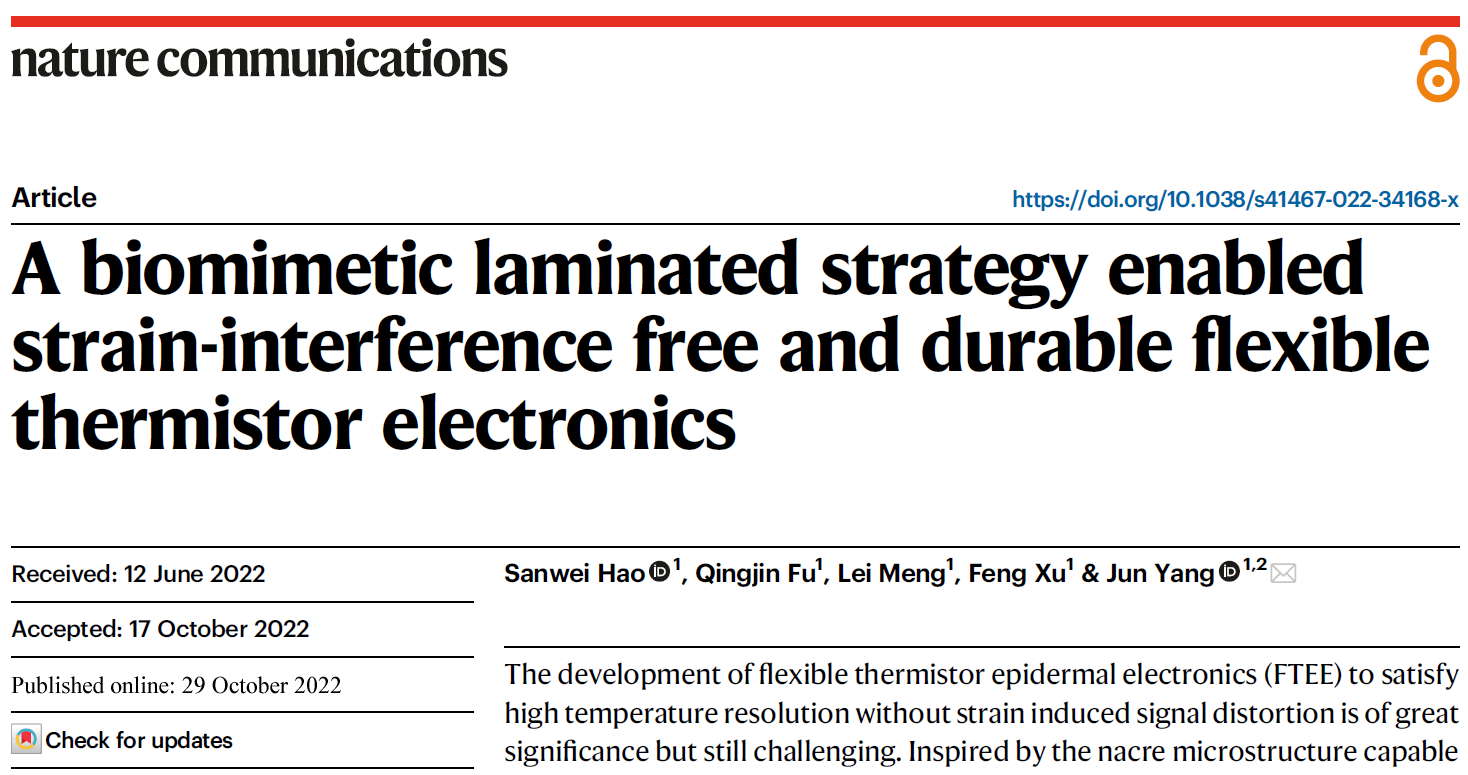 相關(guān)研究成果以《一種仿生層壓策略實(shí)現(xiàn)無(wú)形變干擾且耐用的柔性熱敏電阻電子器件》(A Biomimetic Laminated Strategy Enabled Strain-interference Free and Durable Flexible Thermistor Electronics)發(fā)表在《自然·通訊》(Nature Communications)上,材料學(xué)院博士研究生郝三偉為論文第一作者,楊俊副教授為通訊作者,許鳳教授提供了重要支持。該研究獲得國(guó)家自然科學(xué)基金和中央高?;究蒲袠I(yè)務(wù)費(fèi)專(zhuān)項(xiàng)資金的資助。