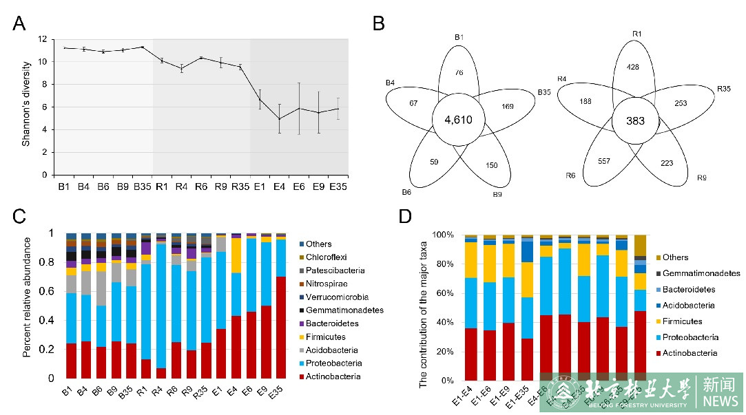 為了研究樹齡變化下的微生物組成的變化以及楊樹發育對植物相關微生物群落的影響,作者對大田土、根際和根內均進行了采樣。分析表明,細菌群落從大田土向根內層的發展停滯。優勢類群放線菌門和變形菌門占整體土壤中總細菌的49.9–66.1%,而占根內圈的72.6–96.5%。值得注意的是,在根內樣品中,放線菌的豐度隨著樹的年齡的增加而逐漸增加。