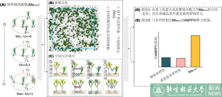 圖1(A.B.C.D.E) 草地群落鄰域空間結(jié)構(gòu)( Ms com )及其與生產(chǎn)力空間變異關(guān)聯(lián)的理論框架、量化方法和科學(xué)假說(shuō)