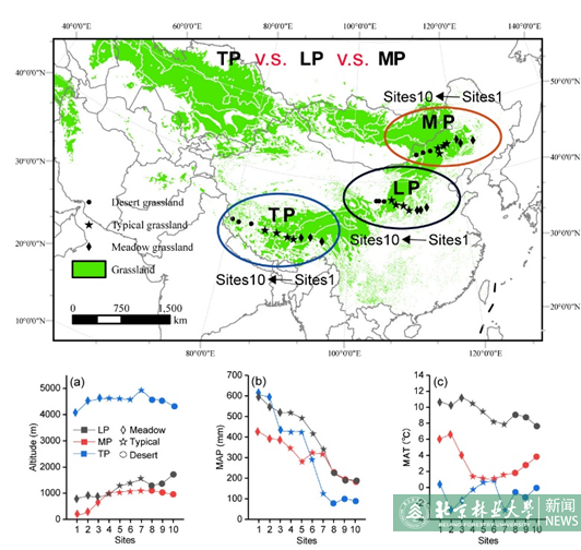 圖2(a.b.c) 蒙古高原(MP)、黃土高原(LP)和青藏高原(TP)上的樣帶分布