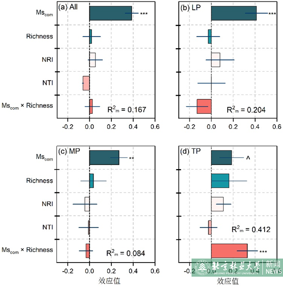 圖4(a.b.c.d) 物種空間隔離指數(shù)(Mscom)和多樣性(物種和系統(tǒng)發(fā)育多樣性)對(duì)ANPP的相對(duì)影響