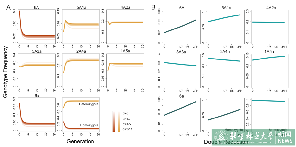 園林學院國家花卉工程技術研究中心與生物學院計算生物學中心研究團隊攻克了將HWE引入多倍體群體遺傳學研究的難題。哈迪-溫伯格定理表明,二倍體群體在沒有進化干擾的情況下,經過隨機交配一代就能達到遺傳平衡。雖然美國著名遺傳學家H.Geiringer早在上世紀中葉就指出HWE在多倍體中是不成立的,它需要多個世代的群體交配才能達到平衡,但研究人員使用孟德爾遺傳定律和群體遺傳學理論相結合的方法,推導出一個簡單的數學模型,發現多倍體不能準確達到平衡,而只能無限趨向平衡。研究人員把這個平衡定義為“漸近哈迪-溫伯格平衡(asymptotic Hardy-Weinberg equilibrium, aHWE)”。對同源多倍體而言,雙減數分裂(double reduction)對多倍體達到aHWE的影響很小,但會影響aHWE基因型頻率的變化,這表明雙減數分裂是多倍體物種進化的驅動因素。