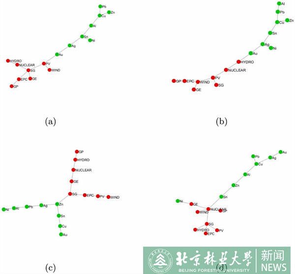最小生成樹:(a)全樣本;(b)新冠疫情之前;(c)新冠疫情期間;(d)新冠疫情以后。