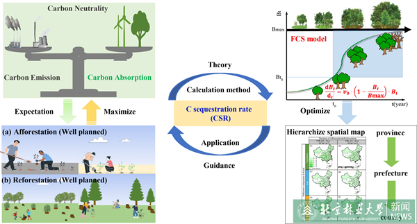 然而,隨著造林適宜區域逐漸減少,未來如何進行造林或再造林規劃,成了管理人員和科研人員的重大困擾。近年來,科學家試圖從溫度和降水對森林生存的影響方面確定適合造林區域,但目前關于其森林碳匯,特別是土壤碳匯信息非常罕見。在哪里造林或再造林最有效地提高生態系統碳匯,還是一個巨大的科學挑戰。因此,迫切需要考慮植被、土壤和生態系統的造林或再造林固碳速率空間圖,為決策者在國土空間統籌下進行科學指導,最大限度地提高造林或再造林的固碳能力,更好服務于國家碳中和戰略目標(圖1)。