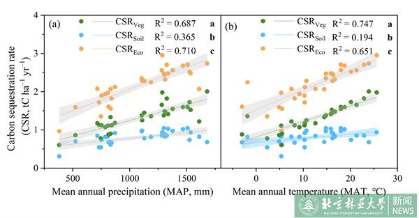 研究結果表明:不同森林成分的固碳速率隨著MAP和MAT的增加而明顯增加,但土壤和植被的固碳速率對氣候因素變化的反應明顯不同(圖2)。結構方程模型的結果顯示,土壤、植被和生態系統固碳速率的變化主要由MAT、MAP和土壤氮含量解釋。值得注意的是,植被和土壤的固碳速率受MAT影響的效應不同,說明森林生態系統固碳速率不能由傳統的植被固碳速率來代表,未來應綜合考慮植被和土壤的影響。
