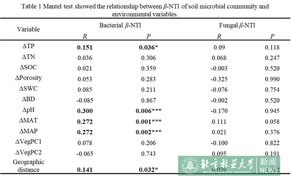 表1.Mantel檢驗分析了土壤微生物群落β-NTI和環境變量之間的關系