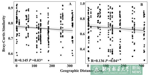 圖2.地理距離與細菌(A)和真菌(B)群落相似性(1-Bray-Curtis distance)之間的關系