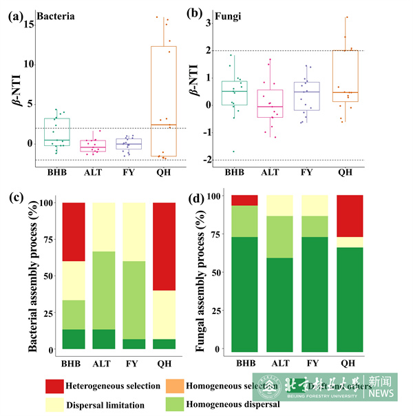 圖3.細菌和真菌群落β最近分類單元指數 (β-NTI) (a–b) 和組裝過程(c–d)