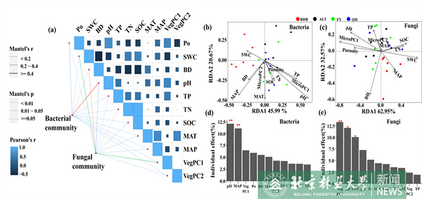 圖5影響微生物多樣性和組成(門水平)的環境因素。(a)Mantel 檢驗確定了影響細菌和真菌群落多樣性的因素; (b-c)冗余分析評估了環境變量對細菌和真菌群落組成的影響;(d-e)環境變量在塑造細菌和真菌群落組成中的相對重要性和顯著性。