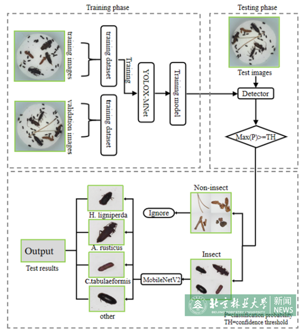 近年來,以卷積神經(jīng)網(wǎng)絡(luò)(Convolutional Neural Network,CNN)為代表的人工智能識別檢測技術(shù)已逐漸應(yīng)用于害蟲監(jiān)測領(lǐng)域。研究團隊設(shè)計應(yīng)用了一個兩階段級聯(lián)卷積神經(jīng)網(wǎng)絡(luò)——YOLOX-MobileNetV2(YOLOX-Mnet),實現(xiàn)了林間信息素誘捕器內(nèi)長林小蠹,以及褐梗天牛Arhopalus rusticus、油松梢小蠹Cryphalus tabulaeformis等害蟲的識別。在第一階段,YOLOX作為目標(biāo)檢測模型識別出圖像中的昆蟲和非昆蟲目標(biāo),并過濾掉非昆蟲目標(biāo);在第二階段,MobileNetV2作為分類網(wǎng)絡(luò),對捕獲的昆蟲進行分類。這種方法可以快速準(zhǔn)確地從誘捕器圖像中檢測出長林小蠹等目標(biāo)昆蟲,并已通過嵌入式遠(yuǎn)程圖像采集器,實現(xiàn)了長林小蠹的遠(yuǎn)程實時監(jiān)測與計數(shù),為手動檢查提供了更高效的替代方案。