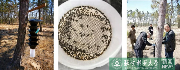 圖1 誘捕器懸掛方式(左),誘捕器內(nèi)大量成蟲(中),工作照(右)