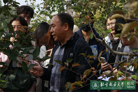 在河北三河市金天地生態園,三河市林草局原副局長路明選向同學們介紹了當地生態園的基本情況,圍繞蘋果樹疏果、病蟲害防治以及質量安全管理等內容,進行全面詳細講解,并現場解答了同學們提出的問題。