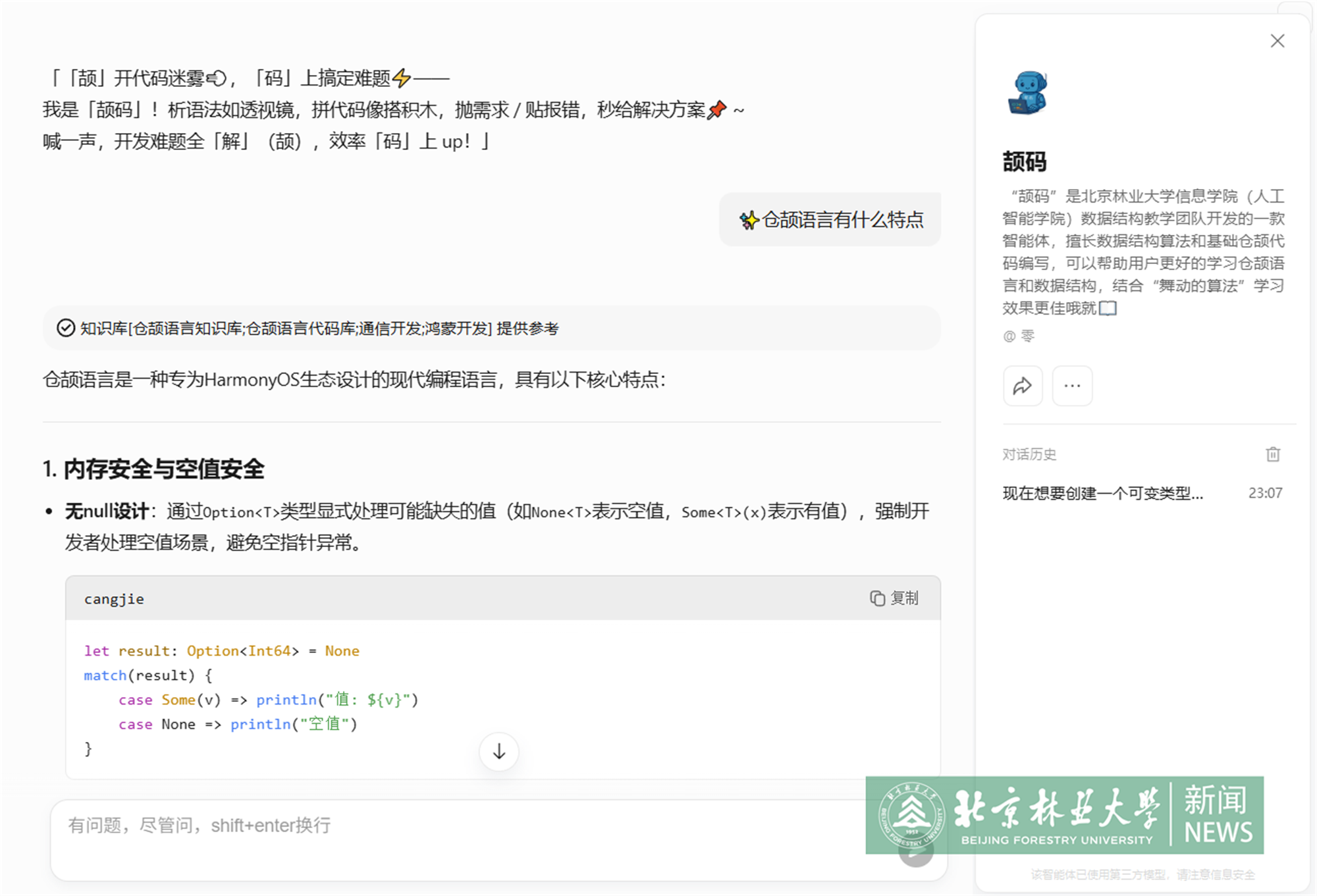 尤為突出的是,系統(tǒng)內(nèi)置了“算法小精靈”與“頡碼”兩大智能學(xué)習(xí)助手。其中,“算法小精靈”基于團隊自建的專業(yè)知識庫,利用檢索增強生成(RAG)技術(shù),可秒級響應(yīng)數(shù)據(jù)結(jié)構(gòu)算法的深度答疑需求;“頡碼”則專注于倉頡語言代碼的輔助編寫與編程難題解答,為學(xué)習(xí)者提供了全天候、個性化的智能教學(xué)支持。