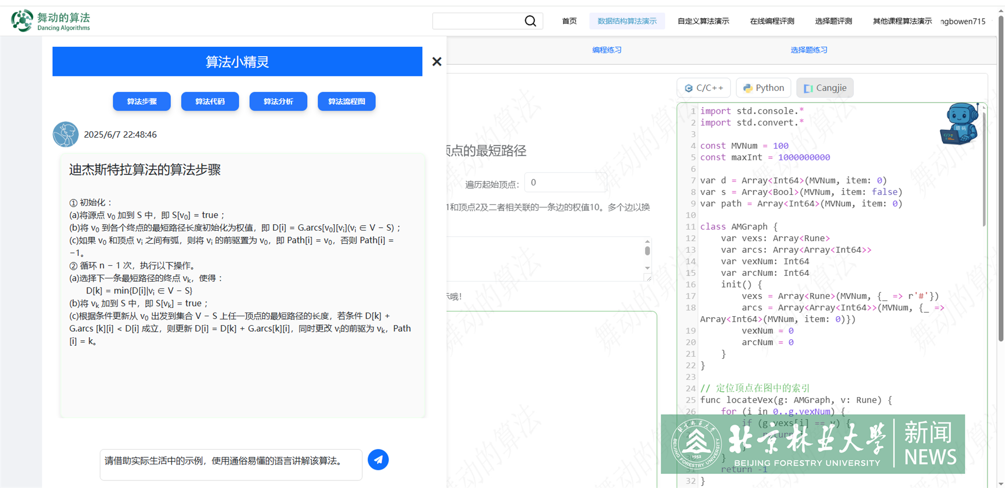 在當(dāng)前國家亟需發(fā)展自主知識產(chǎn)權(quán)、培養(yǎng)創(chuàng)新型科技人才的背景下,該系統(tǒng)作為2025年首批華為產(chǎn)學(xué)合作協(xié)同育人項目“數(shù)據(jù)結(jié)構(gòu)(倉頡語言版)課程建設(shè)”的重要成果之一,不僅為構(gòu)建自主可控的國產(chǎn)技術(shù)生態(tài)體系提供了寶貴的實踐經(jīng)驗,還為破解 "卡脖子" 技術(shù)難題提供了人才保障,更以 AI 賦能教育的新范式,為我國高等教育數(shù)智化轉(zhuǎn)型貢獻(xiàn)了“北林智慧”。