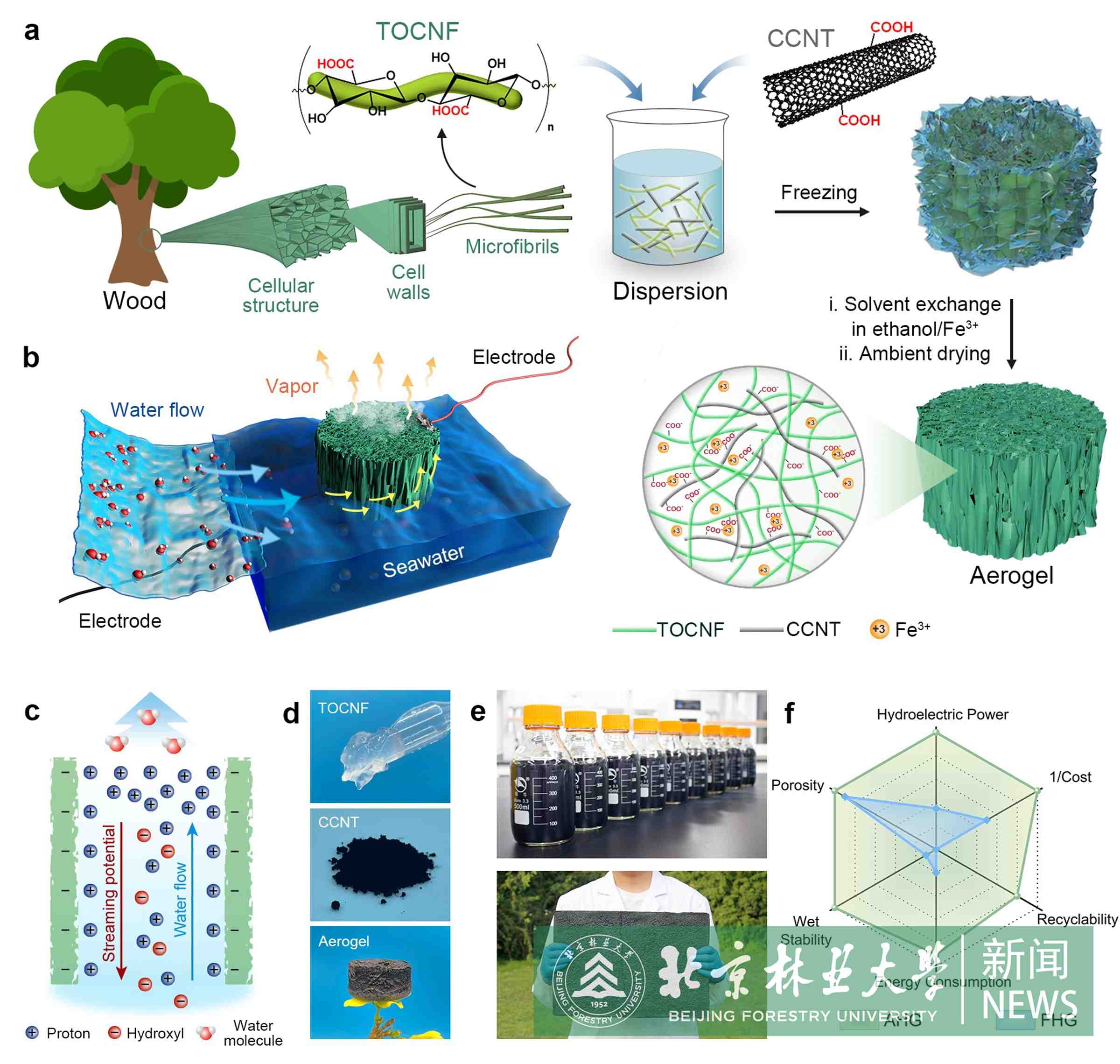 許鳳教授團隊提出了一種納米纖維素/碳納米管復合氣凝膠的常壓制備新技術,并構建了高效水伏發電機。通過原料改性及結構設計,不僅能夠在常壓干燥和水伏發電過程中穩定復合氣凝膠的多孔網絡結構,還能通過增強氣凝膠與水分子的相互作用來增強水伏發電性能。