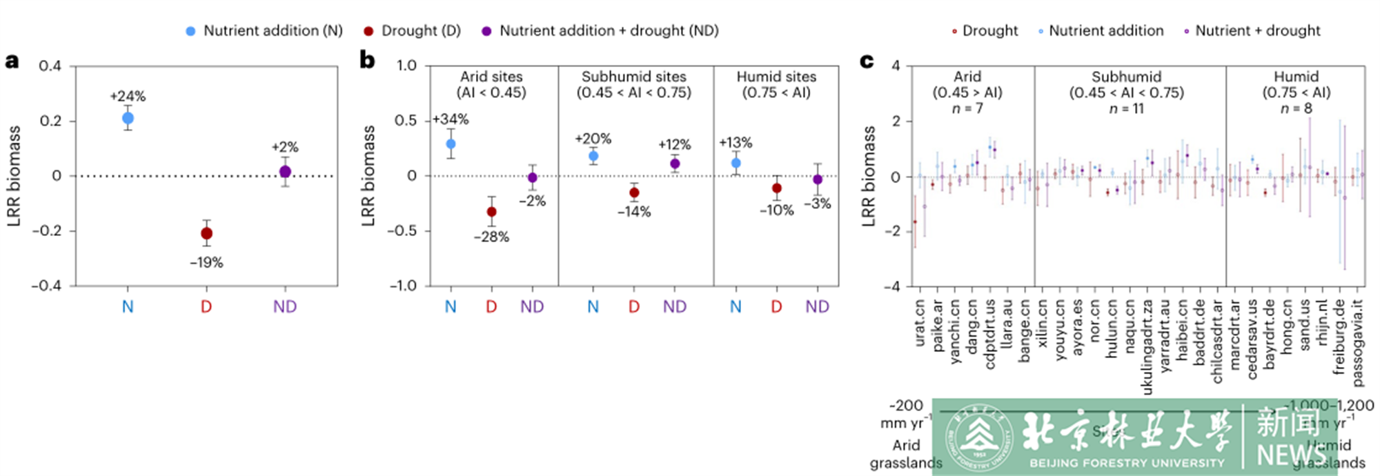 5月19日,草業與草原學院庾強教授以通訊作者身份,聯合阿根廷布宜諾斯艾利斯大學、荷蘭烏德勒支大學等10個國家42家單位的科研人員在《Nature Ecology & Evolution》上發表了最新研究成果“Aridity modulates grassland biomass responses to combined drought and nutrient addition”,探討了草原生態系統生產力對干旱與養分添加及其交互作用的響應及其機制。